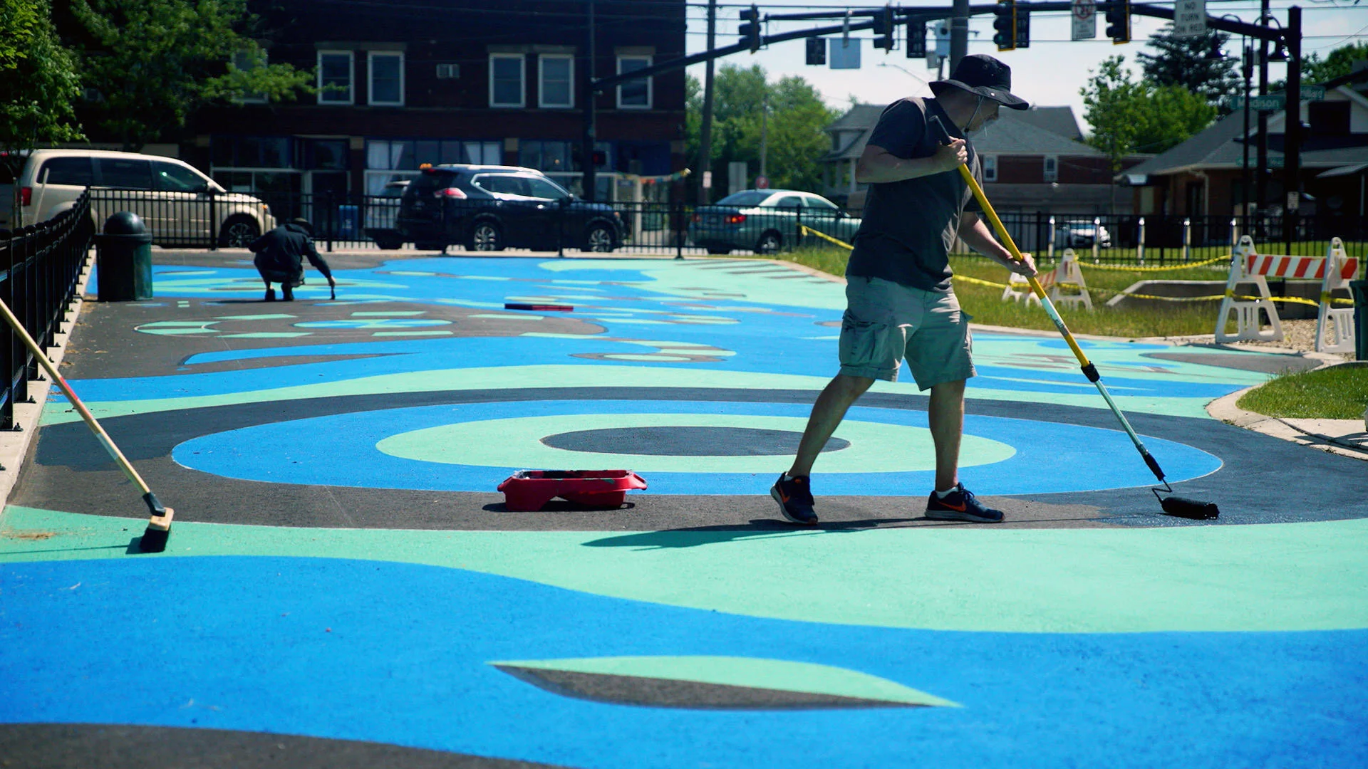 Growing up, Ryan found inspiration in the urban environment, observing and taking influence from the emergence of graffiti art. Most recently, Ryan found his stride in painting very large-scale murals. These massive murals build on his long-held love for public art and street culture while expanding his style beyond traditional graffiti lettering. Ryan is the recipient of several grants and residencies including the CPAC Creative Workforce Fellowship and the Creative Fusion residency, offering him opportunities to paint large-scale projects encompassing thousands of feet of building surfaces. Recent commissions include Warby Parker in Cleveland and New York City, Facebook in Columbus, Ohio, and Rocket Mortgage Fieldhouse in Cleveland, Ohio. Ryan lives and works in Lakewood, Ohio.